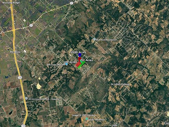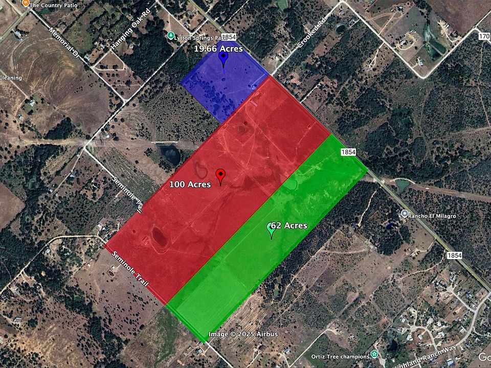 Outstanding redevelopment opportunity with over 181 total acres made up of 3 rectangular lots of 19.66 ac, 100 ac, and 62 ac, purchased together or separately. Utilities onsite, including an 8" waterline along FM 1854, a 4" waterline along Seminole Trail, and electricity on site (2 meters already in place). This flat to gently rolling land is just 8-10 minutes from the 130 toll road, including Highway 21 and 130; just 20 minutes to Austin-Bergstrom, and just 28 minutes to Downtown Austin. Perfect for a medium-density residential development, industrial park, or solar farm. No zoning, only county restrictions for development.