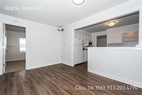 Charming single-level home with classic covered front porch. Remodeled with all new flooring, paint, light fixtures, and more. Nice size Living room with window seat. Eat-In Kitchen. Laundry room just off kitchen. Ceiling fans in both bedrooms. Double closets in both bedrooms. Front bedroom is small but would be ideal for an office.Fenced back yard with patio (on evening-shade side of house), and two storage sheds. Ample parking space with long driveway and convenient turn-around. Located across the street from the elementary school and just two blocks from all the shopping and dining in Downtown Overland Park.Enjoy Single-Family living for an Apartment price!