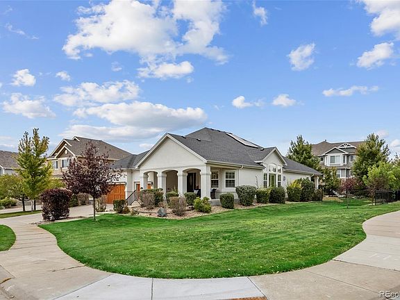 Your stunning ranch home in Blackstone Country Club awaits! This desirable corner lot features expansive main floor living, just steps from the golf course. You’ll enjoy cathedral ceilings, an open-floor plan, and a fully finished basement. Inside, find a bright, inviting living space with a modern kitchen - complete with a double oven, gas range and range hood, and plenty of pantry space. The kitchen expands into the eating area with a full coffee bar set up which is perfect for entertaining. The kitchen opens up quintessentially to the family room where you can catch your favorite show featuring un upgraded sound system, or cozy up to the dual-sided, gas fireplace which opens up to both the family and dining room areas. The main floor office is tucked away from the living space providing a dedicated spot for work-at-home. The main-level primary suite offers a peaceful retreat with a fireplace and five piece bath, while additional bedrooms and the living room provide flexibility for guests, hobbies, flex space or a home office. The finished basement expands your options with a generous family room, additional bedroom, full bath, wet bar, and plenty of space for a gym, media area, or playroom. Outside, enjoy your nearly 1/3 acre corner-lot yard — perfect for barbecues, gatherings, or relaxing after a day at the country club. This location is truly unbeatable: bike the trails of Sampson Gulch, paddleboard or fish at Aurora Reservoir, or enjoy time with your pups by simply walking the neighborhood. After a long day, unwind with dinner or drinks at the club or grab a craft beer with friends on the patio at Bent Barley Brewery. Winter brings ice skating and year-round shopping at nearby Southlands. This home offers the perfect blend of comfort and convenience all while gaining access to a private club where you can enjoy the fitness center or join a round of golf in Colorado’s great outdoors.