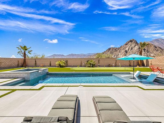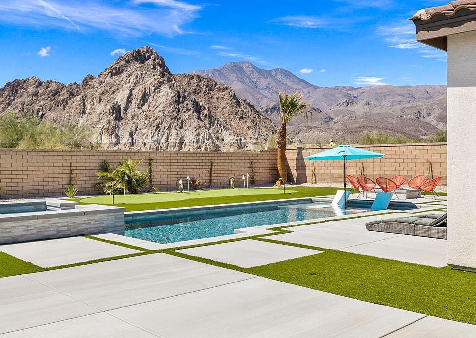 Better Than New! This never-lived-in home is perfectly situated in a premier South La Quinta location with stunning south-facing mountain views. Nestled at the foot of Coral Mountain, this desirable community of single-family homes is just minutes from PGA West Golf Course and a short drive to charming Old Town La Quinta. Step inside to an open-concept floor plan featuring a light and bright kitchen with white cabinetry, a spacious pantry, and a seamless flow into the great room -- perfect for entertaining. Offering 4 generously sized bedrooms, including a private primary suite with a direct door to the backyard. The newly completed backyard is an entertainer's dream, featuring a Pebble Tec pool & spa, putting green, gas firepit, plumbed BBQ, and a smart pool system for easy control. Additional highlights include upgraded flooring throughout, a tandem 3-car garage, low taxes, and low HOA fees. Don't miss the opportunity to own this stunning South La Quinta retreat!