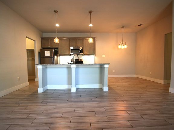 This fabulous home combines style and functionality. It features 3 bedrooms and 2 bathrooms, along with a 2-car garage. The interior boasts beautiful hardwood-like tile flooring, a large kitchen island, granite countertops, custom-built cabinets, modern light fixtures, and stainless steel appliances. All bedrooms offer ample closet space and include ceiling fans for added comfort. The laundry area is conveniently located just off the kitchen and includes full-size washer and dryer connections. A wooden fence surrounds the large backyard, providing privacy and space for outdoor activities.