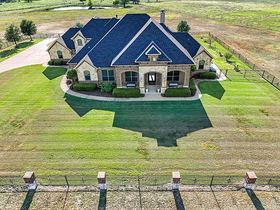 Experience country luxury at its finest in this beautifully maintained 5-bedroom, 4-bath estate set on approximately 5 acres in Kaufman, TX. With over 4,100 sq. ft. of living space, this traditional brick and stone home offers the perfect blend of elegance, comfort, and functionality — complete with a pool, three-car garage, and pipe rail fencing for added privacy and security. Step inside to discover an open floor plan with vaulted ceilings, hardwood floors, and abundant natural light. The spacious living room features a cozy stone wood-burning fireplace, while the gourmet kitchen impresses with granite countertops, a large island, walk-in pantry, and stainless steel appliances — including an electric cooktop and oven. Enjoy both a formal dining room and a sunny breakfast area ideal for family gatherings. The primary suite offers a true retreat with a sitting area, luxurious ensuite bath featuring a jetted tub, dual vanities, granite counters, and a large walk-in closet. Additional bedrooms provide ample space, with several including ensuite or Jack-and-Jill bathrooms — ideal for guests or multi-generational living. Upstairs, a game room and extra storage room provide flexible space for entertainment or hobbies. A private outdoor oasis shines with in-ground pool, extended patio with lush landscaping, and plenty of room for entertaining or enjoying quiet evenings under Texas skies. Recent updates include a newer roof (approx. 3 years old), two AC units (1 year old), and two water heaters. TVs, refrigerators, washers, and dryers convey with the sale. Located in the Scurry-Rosser ISD, this home offers peace, privacy, and convenience — just minutes from town amenities. Don’t miss your chance to own this private countryside retreat with modern luxury and timeless appeal.
