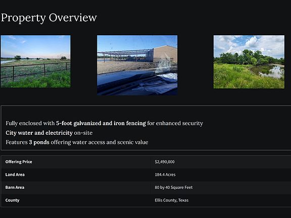 Whether you're planning a large-scale development, a private ranch, or a long-term investment, this versatile property spanning Italy and Avalon, Texas delivers the infrastructure, space, and location to bring your vision to life.