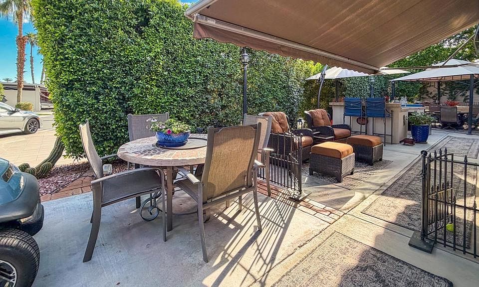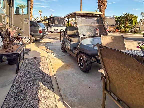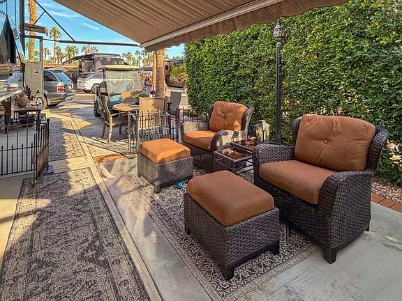 Outdoor Resort Indio is a Class A Motorcoach resort. This is an RV lot. This inviting, private RV lot features a nice outdoor kitchen with tile countertops, an induction cooktop, refrigerator, hot water, garbage disposal, and impressive storage--perfect for cooking and entertaining. The lot includes convenient mid-lot hookups for added flexibility.Enjoy relaxed outdoor living under the charming gazebo with a ceiling fan, complemented by two large umbrellas that expand your shaded space, along with a tranquil water feature that enhances the atmosphere. Furnishings are negotiable, offering flexibility for your personal style and needs. The rear of the lot offers generous living space, quiet surroundings, and excellent protection from afternoon sun and wind.