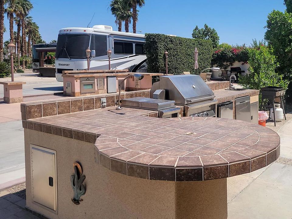 Outdoor Resort Indio is a class A only RV resort and this is an RV lot.Enjoy privacy, comfort, and resort convenience with this beautifully landscaped lot located just a short walk from the satellite pool, hot tub, sauna, and laundry. The inviting medium-sized outdoor kitchen features a round bar with umbrella and four chairs, built-in gas burner and large BBQ, oven, dishwasher, refrigerator, sink, and storage, all enhanced by ample lighting and hot water for effortless entertaining.Multiple seating areas include a dining table with umbrella, an outdoor fire table flanked by two sofas, and additional chairs and side tables--perfect for gathering with friends. This is a private and well-designed lot offering a true resort lifestyle.