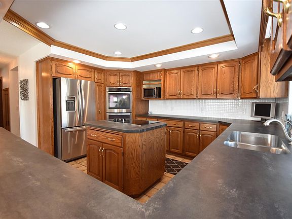 Tucked away in a quiet cul-de-sac on top of Minot's North Hill, this 4000 sq ft home with attached 4 car garage overlooks the entire city! Inside this spacious home you will find 5 bedrooms, 3.5 bathrooms, two kitchens & tons of character not found in the cookie-cutter new construction house. The main level offers a spacious kitchen with ample cabinets, brand new countertops with breakfast bar and new stainless steel appliances including a French door refrigerator, smooth top cooktop, double wall oven & even has space for a wine fridge! The dining room features French doors that lead to the to 14x30 foot deck that is perfect for summer barbecues & entertaining & has stunning views of the city. The living room has a unique cut out allowing you to see and hear what's happening in the kitchen but still offering you a defined space. An office with built-in cabinets & desks, laundry room with storage & a half bath complete the main floor. Upstairs you will find a huge master suite which includes an attached dressing room that could be used as a sitting room or nursery. The massive master bathroom features a jetted tub, walk-in shower, makeup vanity, double sinks and large walk-in closet. Two more large bedrooms & another full bathroom round out the upper level. The lower level is perfect for an in-law suite or home based business. It features a full kitchen, living area two bedrooms and a full bath. You must see this house to appreciate all the potential it holds.