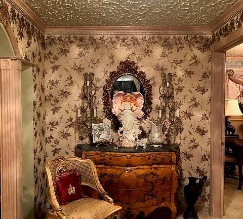 A 2nd formal living is graced by a baroque style wood burning fireplace, while dramatic lighting fixtures, textured walls, decorative ceilings and intricate woodwork enhance the home's charm. The primary suite offers a spacious bedroom with his & hers baths and closets, and elaborate garden tub. Storage abounds with built-ins throughout, complimented by plantation shutters and elegant draperies. Indoor safe included. Additional features include an elevator, 3 car garage, outdoor gazebo & landscaped gardens equipped with sprinkler system and lighting.