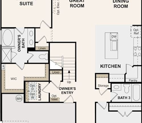 This beautifully designed home at Averitt Landing offers smart functionality and plenty of space for the way you live today. Just off the foyer, a private study with LVP flooring creates the perfect work-from-home setup or quiet escape. The open-concept layout brings everyone together, with an extended kitchen featuring sleek dark gray cabinets, a center island, and a spacious great room anchored by an electric fireplace. A built-in valet near the garage helps keep things organized, and the dining area opens to a covered patio for effortless indoor-outdoor living.