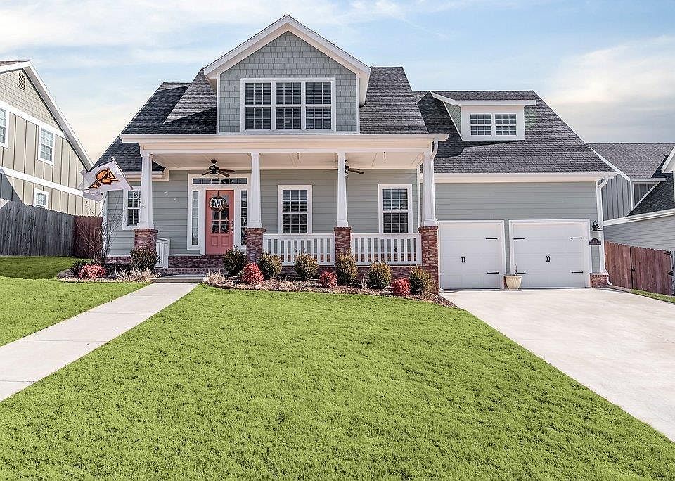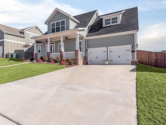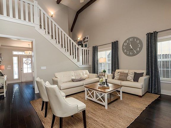 5 panel doors, crown molding, beams on vaulted living ceiling, dark wood flooring, and open floor plan. Kitchen has gas range, stainless appliances, tile back splash, under cabinet lighting, double farmhouse sink, and designer cabinetry. Master suite with beautiful ceiling detail and master bath w/ separate sinks, fully tiled walk in shower w/ rain head, walk in closet w/ built ins, and corner jetted tub. Covered front porch and large entertainment patio with gas grill and tv hookups in the back.