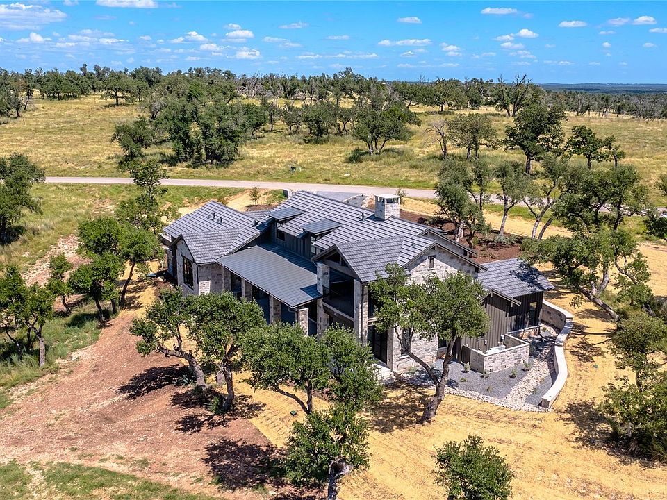 From the expansive outdoor living spaces, the homesite offers a 180-degree north-facing panorama across some of the highest elevations in Boot Ranch. The site on LaGrange Drive has abundant native grasses, shrubs and oak trees, and the landscape plan includes new native plantings and small manicured lawn areas surrounding the home and driveway. This wonderful family home takes its inspiration from historic German architecture in the region but adds contemporary features like an open great room, lavish master suite, and large upstairs game room. Exterior materials include natural stone, steel and glass entry doors, black-clad windows, concrete wood-shake style roof, standing-seam metal porch roofs, and scored concrete flooring on patios and porches. A generous foyer with double doors leads to the great room, with high beamed ceilings, 48" stone fireplace, open kitchen and breakfast bar seating for five. No detail was overlooked in the open kitchen design which features a cast iron farmhouse sink and premium Thermador appliances: 48” refrigerator, 48” six-burner and griddle gas cooktop with vent hood, microwave drawer, and dishwasher. A full-wall of sliding French doors open to a 14’x40' covered terrace with spacious patio and outdoor kitchen, perfect for your outdoor entertaining. The outdoor kitchen includes a 42” built in gas grill with stainless steel vent hood, undercounter fridge, concrete counter tops and lots of storage. The master suite is located on the right side of the home, and includes a walk-in closet, bathroom with freestanding soaking tub and shower, and beamed ceilings in the bedroom. On the opposite end of the home is the second and third bedroom, with the second having a private covered terrace. The upstairs includes a large game room with covered balcony and additional room that could act as a 5th bedroom, each with full separate bathrooms. Don't miss your opportunity to become part of Boot Ranch, the finest private club community in Texas.