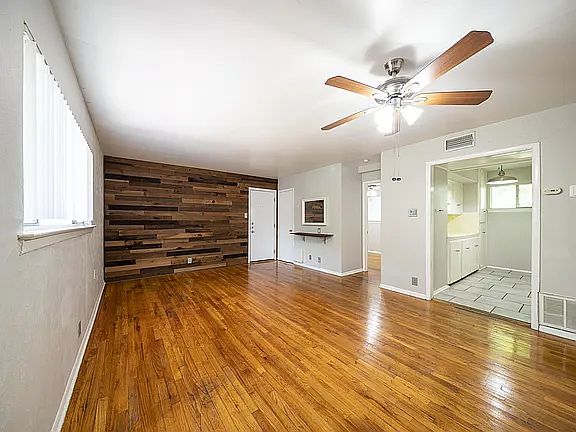 Stained concrete. First-floor. One assigned parking space. Gas Cooking. Corrugated metal accent wall. Shower in tub. Ceiling fans. Central air and heat. Ample storage. Convenient to downtown, flexible living space.