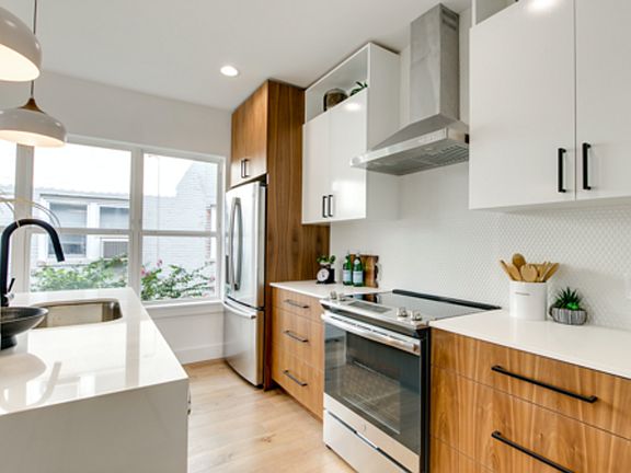 - White oak cabinetry, two toned upper and lowers accented with matte black pulls
