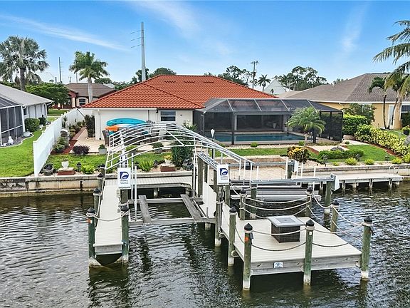 BEAUTIFUL LAKEFRONT HOME! Most furnishings, TVs, and wall hangings are included. Enjoy spectacular views and gorgeous sunsets overlooking beautiful Lake Kennedy from your new home! Lake Kennedy is part of an extensive freshwater canal and multi-lake system for fun and fishing on the water. This home is the best of every possibility on a large lake from time on the water boating, kayaking, and riding jet skis, to relaxing from your outdoor tiled patio, sitting on the dock, or a cozy evening at the fire pit. This spacious split floor plan provides room to stretch with a large kitchen, a comfortable living room, dining room, breakfast bar, family room, pool bath, and large lanai with outdoor sitting areas. The 3 BR/2Bth home boasts vaulted ceilings, tile floors, walk-in closets and ceiling fans throughout. The current owners have invested in substantial renovations and improvements of the property while maintaining the Spanish theme of the Hacienda type property. They have invested more than $250,000 in renovations and improvements making this property move in ready and trouble free for years to come. Impact windows with a lifetime warranty, hurricane rated garage door, built in cabinets in garage, built in fire pit, outdoor adjustable color low voltage lighting, electric hurricane shutters in lanai - 2023, several docks, boat lifts - 2021, Decra premium metal granular roof – 2023, upgraded large tonnage AC - 2021, new pool pump 2021, new pavers on lanai and dock 2022, new full living room remodel with cool neutral color scheme - 2023, upgraded irrigation system – 2023, and vinyl fence 2022. New appliances in 2023 include stainless refrigerator, microwave, oven, washer/dryer, and water heater. Home is also walking distance to Pickle Ball courts, Kiwanis Park, and Sun Splash Water Park. Located convenient to shopping, restaurants, schools, parks, with easy access to beaches, and Sanibel. Great for investors who want to take advantage of a great rental property! Don’t miss this rare find in paradise!