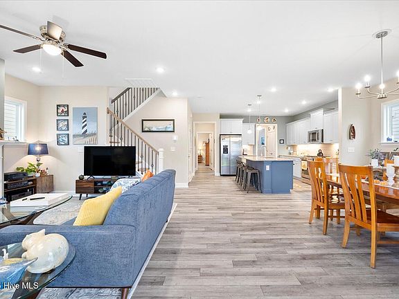 The open concept living, dining, and kitchen space, provides a gathering place Sunlight dances across the gourmet kitchen as it takes center stage...with gleaming granite countertops, soft gray cabinetry, a custom blue island, designer subway tiles, gas stove, and polished nickel accents create the perfect place to sip, stir, and savor.