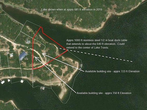 Just a few easy steps from your door to the water's edge. Rare opportunity to build your own peninsula paradise on LakeTravis; part of ~10 secluded acres on ~1700' of waterfront. No HOA. PGA courses, tennis club, Spicewood airport 5 miles.20 min drive to Wholefoods/Hill Country Galleria/Spanish Oaks Golf & Tennis Clubs, Lakeway (private health club, 3 golfcourses, Airpark) or Horseshoe Bay (resort, multiple golf courses, airport with 6000 ft lighted airstrip that canaccommodate jets up to a DC-9.