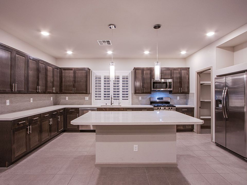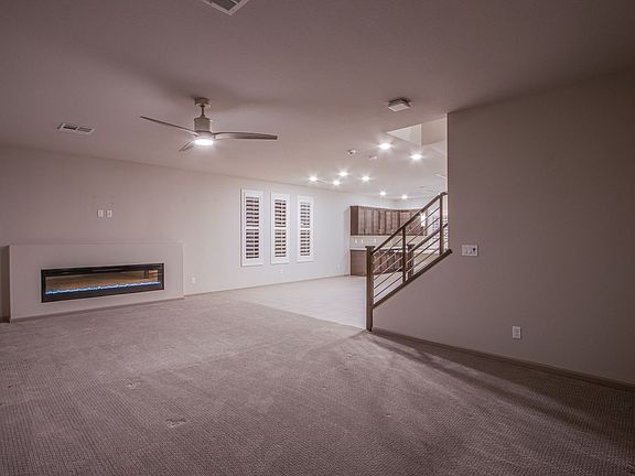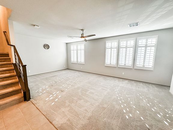 Great room features a large linear fireplace. Recessed lighting and Sunburst shutters throughout! Modern kitchen with custom cabinets, tile backsplash, upgraded stainless steel appliances, walk in pantry, quartz countertops, and large kitchen island. Spacious primary bedroom suite with bathroom featuring dual sink vanities, walk in shower, and built in organization system in primary closet! Pristine carpet and tile throughout. Great recreation room downstairs! Amazing view of the strip and Red Rock Mountains from the rooftop deck! Easy care landscaping. Half a mile from 215 freeway and conveniently located near shopping, dining, entertainment, etc!