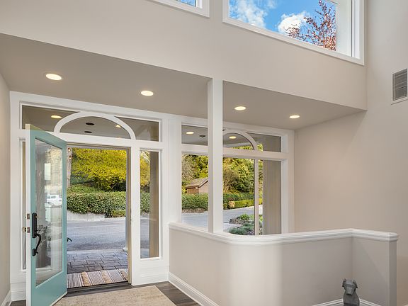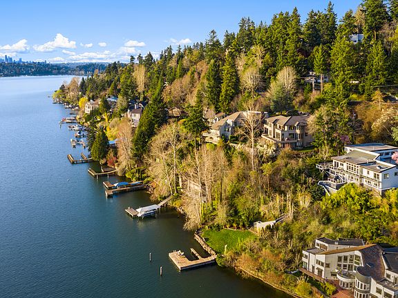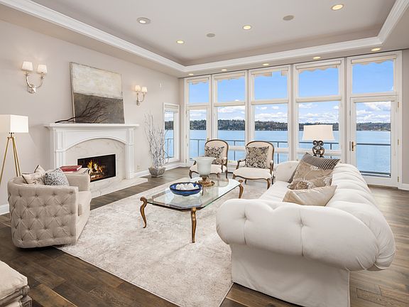 Lifestyle on the water: dramatic sunsets, meditative mornings, and Mt. Rainer view. Classic allure blends perfectly with today's trends. Owner Suite on main. Most rooms boast elevated southwest facing views over 80' of high-bank waterfront and private deep water dock. Turn-key with high-end updates ~ fresh and crisp. Generous fun center for movies, games, or ADU. Complemented by rare flat party parking off a private lane. Multi-gen options. Sports 6-car garage! Coveted Mercer Island Schools.