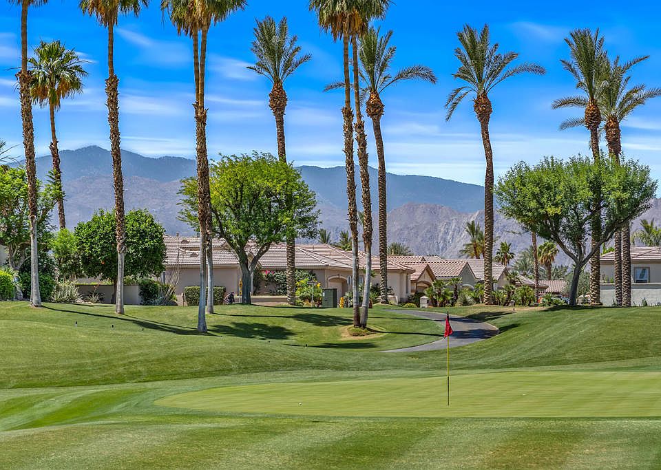 SOUTH VIEWS of the 15th green, fairway and beautiful local mountains. Located just a short stroll to the clubhouse, this lovely 1827 sq.ft. 2 bedroom 2 bath home has never been on the market prior. Featuring an open great room design, beautiful slab granite kitchen counters, refinished cabinetry, SolaTube above kitchen sink for loads of natural light, Plantation shutters, extra deep garage to accommodate a golf cart and French doors in lieu of sliders. The roomy primary suite has dual closets, split vanities and custom tiled large shower and soaking tub. Additional upgrades include three bay windows, Fireplace, built-in BBQ, surround sound, artificial turf and entry courtyard. Located near the 15th green, the extended and covered SOUTH facing rear patio is a wonderful place to relax and take in the peaceful desert lifestyle. Heritage Palms is a premier adult community featuring an 18 hole championship golf course, indoor & outdoor pools, pickleball & tennis courts, fitness center, grill room, card rooms, billiards room, social clubs and more.