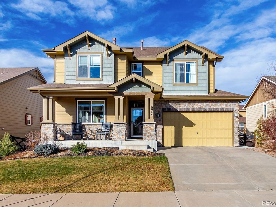 Upstairs, an open landing connects the primary suite, three bedrooms, and a full bathroom. Step through French doors into the private retreat. The ensuite includes updated sintered countertops, new lighting, a dual vanity with real wood cabinetry, a walk-in closet, plus a soaking tub and separate shower. The finished basement adds versatility with a family room wired for sound, a bedroom, 3/4 bath, storage, and a flexible nook ideal for a gym or hobby space. A standout feature is the finished and insulated 3-car tandem garage with a heavy-duty insulated door, workbench, overhead storage, and direct backyard access—perfect for Colorado gear and tools. Additional highlights include new LED ceiling lights, a whole-house humidifier, manifold plumbing, under-stair storage, and front and back sprinklers. Located on a quiet cul-de-sac, you’re within walking distance of the community recreation center and Banning Lewis Ranch Academy, with convenient access to Vista Water Park, Climber’s Park, and seasonal concerts, events, and the farmers market—offering a lifestyle that’s active and connected. Move-in ready and thoughtfully upgraded—this home is one you won’t want to miss.