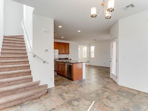 The kitchen shines with maple-finish cabinets with crown molding, granite countertops, recessed lighting, a walk-in pantry, and tile flooring. Inside, you'll love the textured walls and open design, while outside, a covered patio and low-maintenance desert landscaping make relaxing and entertaining a breeze.