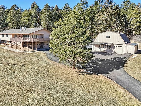 Gorgeous 2 acre parcel ideally located on a serene, gently sloping site in the sought after Golden Meadow community. Quiet retreat with amazing views has the rare advantage of 2 upgraded homes, providing genuine flexibility with a remodeled main residence and an updated permitted 1,280 sqft guest home. For a total of 4,132 finished sqft, 6 beds, and 5 baths across 2 distinct living areas, it's ideal for multi-generational living, guests, or income producing opportunity. Beautifully upgraded main home has fresh interior/exterior paint and resilient plank vinyl flooring throughout. Bright, open floorplan features a vaulted great room with a cozy wood burning fireplace and a glass slider leads to an expansive wraparound deck, perfect for relaxing or entertaining. The dining area opens to a gourmet kitchen with all new stainless steel appliances, solid granite countertops and a large waterfall edged center island with breakfast bar seating. Upper level has a primary suite with 3 closets, including a walk-in, and a stunning updated private 3/4 bath, plus 2 beds and a spa inspired bath. Lower level offers 2 more beds, full bath and a laundry room. A standout feature is the ADU, which lives like a true 2nd home with zero entry access, open living room, and full kitchen. Main level bedroom with en-suite 3/4 bath and laundry, while the unfinished upper loft offers potential for a 2nd bed and has a 1/2 bath. Includes HE HVAC, finished oversized 1 car garage with epoxy floor, newer garage door and heated/cooled by central HVAC unit. Class 4 impact resistant roofs on both homes. There's a radon mitigation system and a generator. Enjoy Colorado living on the back patio or wraparound deck overlooking your wooded property with foothills views. Fenced areas, dog runs, private well, hot tub ready space, RV parking with 30-amp hookups and dump access, paved circular driveway, and a total of 3 heated garage spaces, including EV charging. Close to trails and open space, and just 5 miles to Conifer with shopping and dining. Easy access to Hwy 285 and C-470.