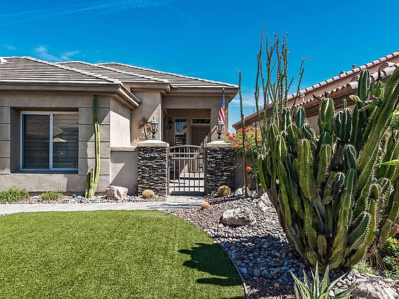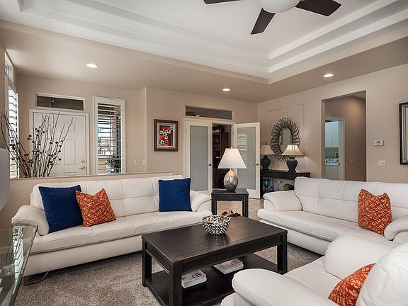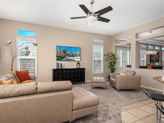 Stunning Golf Course Home in Heritage Palms Fully Furnished & Move-In Ready! Welcome to this beautifully upgraded 2,061 sq. ft. Southampton model in the highly desirable Heritage Palms Country Club! Perfectly positioned on the 10th hole, this home offers breathtaking golf course and mountain views from your expanded, covered rear patio ideal for relaxing or entertaining. Inside, enjoy a bright and spacious layout featuring 2 bedrooms plus a den, and two beautifully updated bathrooms, including a luxurious soaking tub in the primary suite. The kitchen is a chef's dream, complete with Bosch appliances, slab granite countertops, island, and tile backsplash. Additional highlights include a custom brick driveway and front courtyard, plantation shutters throughout, epoxy garage flooring, and extra garage space for a golf cart. Best of all, this stunning home is sold fully furnished, ready for you to move right in! Located in a premier Active Adult Community bordering North La Quinta, Heritage Palms offers an array of amenities for just $400/month HOA: cable & internet, full-service clubhouse, restaurant, lounge, 18-hole championship golf course, pro shop, tennis & pickleball courts, indoor/outdoor pools, fitness center, and vibrant social clubs. Don't miss your chance to own a piece of resort-style living!