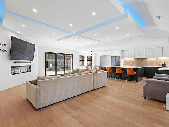 Cozy brick fireplaceMassive backyardNew flooringOpen grassy areasStainless appliancesSerene park-like atmosphereModern island