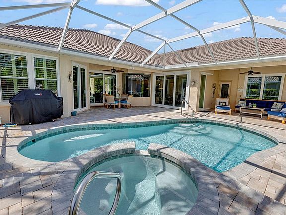 Tucked away in the exclusive gated enclave of Edgewater Village, just moments from the bustling charm of Lakewood Ranch Main Street and a block from the serene marina, this stunning 4-bedroom, 3-bathroom estate with a private den by Lee Wetherington is the epitome of luxury, tranquility, and modern convenience. Set on a premium preserve lot with captivating sunrise views, the home is perfectly positioned to embrace Florida’s natural beauty. Mornings begin with the golden glow of dawn reflecting over the resort-style pool and spa, creating a serene retreat for coffee, yoga, or a refreshing swim. The newly designed pavered lanai and pool deck provide the ideal setting for elegant outdoor entertaining or quiet evenings under the stars, all framed by lush, undisturbed preserve views. Inside, the home’s soaring ceilings, custom architectural details, and sun-drenched interiors create an inviting yet sophisticated atmosphere. Designed for both comfort and functionality, this spacious layout features four well-appointed bedrooms, three full baths, and a private den, perfect for a home office or flex space. Thoughtfully upgraded with a new roof (2024), new A/C (2024), premium interior paint (2024), brand-new kitchen appliances (2024), a new water softener (2024), designer kitchen backsplash (2025), and hurricane-rated windows and doors (2025), this home offers both style and peace of mind. Beyond the residence, experience an unmatched lifestyle in one of Florida’s most sought-after communities. Enjoy championship golf courses, premier tennis and pickleball courts, over 150 miles of scenic trails, vibrant social clubs, top-rated schools, and pristine parks. With downtown Sarasota’s culture and dining just 30 minutes away and the world-famous Gulf beaches only 12 miles from your doorstep, this exceptional estate is a rare opportunity to enjoy luxury, privacy, and an effortless Florida lifestyle—all with low HOA fees.