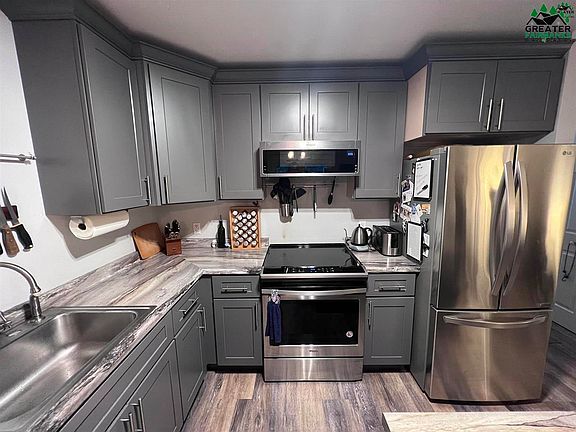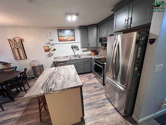 Beautiful condo in downtown Fairbanks! Centrally located near trails, parks, and the river while still being minutes from all the amenities and events Fairbanks has to offer! This 2-bedroom, 1.5-bath condo has so much more going for it than just its prime location. Enjoy thoughtful updates throughout, to include new laminate flooring, contemporary lighting, a modern kitchen, AND refinished bathrooms. An open concept main area offers a great use of space while the upstairs features vaulted ceilings and a large primary suite. Kick back and watch the clouds go by on your back patio overlooking a grassy lawn. 1-stall garage for parking, and many other amenities for easy living! This one will not last long - schedule your showing today!