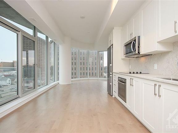 The New Brando suite, in Ottawa's tallest residential tower, balances comfort with convenience, placing everything close at hand, but allowing for a serene sense of space. Luxurious finishes are featured throughout the 730 sq. ft. suite with 1 bedroom and 1 bathroom. The sleek lines of the Euro-style kitchen and luxurious finishes in the spa-inspired bathrooms create a sensory experience. From floor to 11' ceiling, and wall to wall, every detail is considered. Windows surround the entire suite, offering spectacular natural light and views. An open-concept floor plan, floor to ceiling windows. Enjoy the stunning views from the wrap-around balcony that arcs gracefully from the building facade.