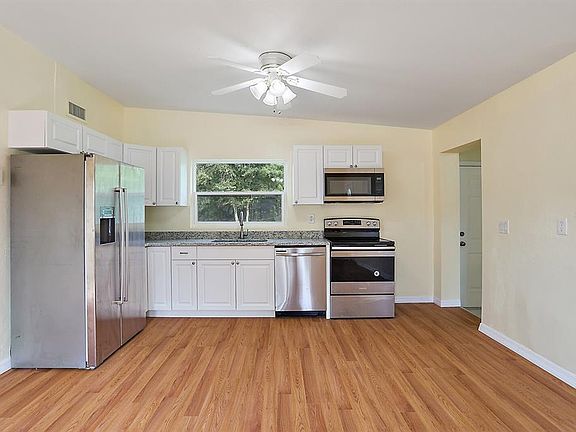 This affordable 3 bedroom, 1 bath home has been fully renovated with No HOA fees and is situated on a half acre lot close to Sunset Island Park where you and your kids can enjoy a skate park, basketball, racquetball, tennis, and a playground just a few blocks away. The home offers a NEW ROOF, new kitchen that includes stainless steel appliances and granite countertops, new laminate wood flooring throughout, new doors, new HVAC, new hot water heater, new electric panel, newer windows, renovated indoor utility room, and fresh interior and exterior paint. The bathroom is fully remodeled with beautiful porcelain tile. The large backyard is fenced and has a new shed for extra storage along with 2 concrete pads in place where you can have a fire pit and enjoy the outdoors. It's also just a few minute drive to Ferran Park and Eustis Aquatic Center pool. You can enjoy events throughout the year downtown Eustis with shopping and restaurants. Dont miss your chance to own this home today.