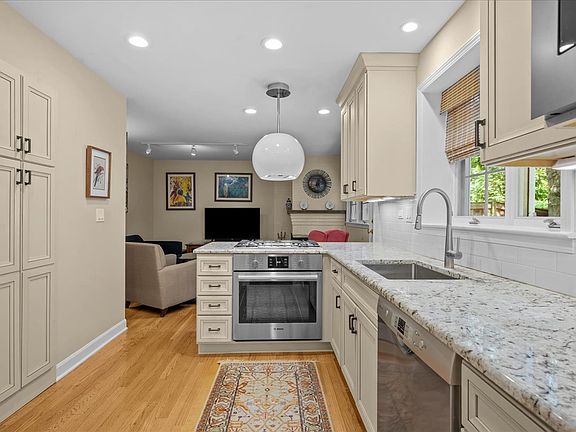 Welcome to this light-filled, updated 3-bedroom, 3.5-bath brick townhome featuring an attached two-car garage and a fenced backyard. Hardwood floors flow throughout the main and upper levels, enhancing the spacious living room and separate dining room with direct patio access. The bright, updated kitchen boasts granite countertops, stainless steel appliances, and an eat-in peninsula that opens to the family room, complete with a cozy fireplace and additional access to the backyard. Upstairs, the expansive primary suite offers a walk-in closet and double vanity. Two additional bedrooms, a full hall bath, and a conveniently located laundry room complete the second level. The finished basement adds versatile living space, perfect for recreation, with a full bath and a large storage area. Ideally situated, this home provides easy access to highways and public transportation, and is just minutes from shopping, dining, parks, and top-rated schools.