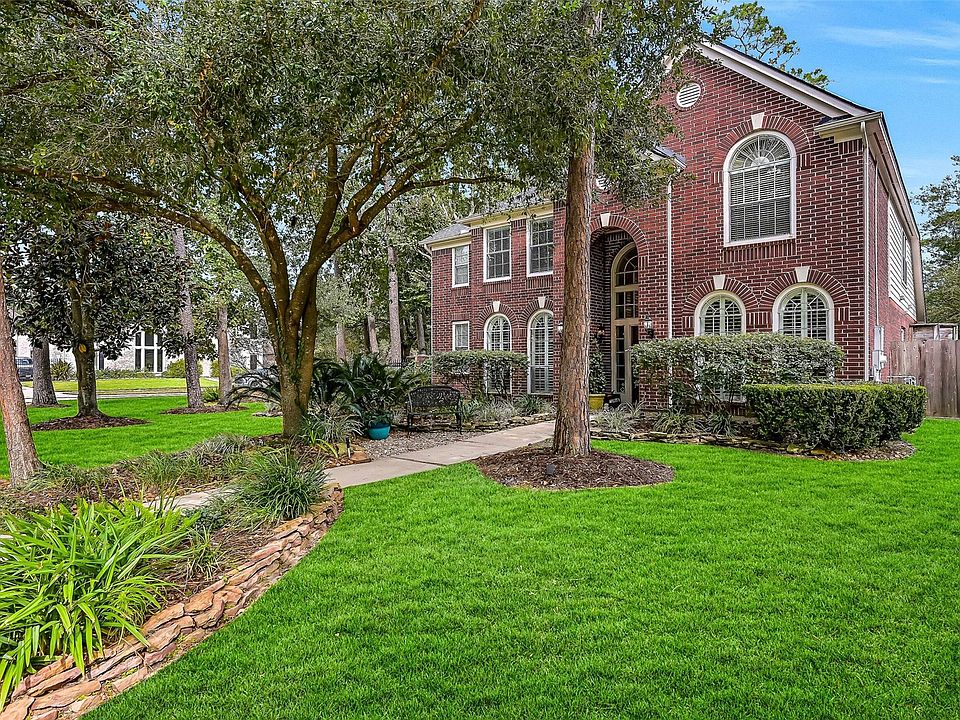 Complete privacy awaits among towering pines at this exquisite 4-bedroom retreat located on a large corner lot with a sparkling pool, peaceful patio with an outdoor kitchen, beautiful low-maintenance landscaping, & green space with walking trail access just across the street! This inviting sanctuary features a soaring 2-story foyer with a sweeping curved staircase, cased windows with plantation shutters, & wood-look tile floors throughout both formals & a spacious den with a gas log fireplace, TV niches, & spectacular pool views. A raised serving bar extends into the kitchen that showcases white 42" cabinetry, granite countertops, recent stainless appliances, and a glass cooktop with a gas connection available. A large master features a remodeled spa-worthy bath with garden tub and an oversized shower. Upstairs gameroom, loads of storage, 3-car garage, & well-maintained with recent interior/exterior paint, roof, HVAC, & on a cul-de-sac lot! NO FLOODING & ready for your personal touch!