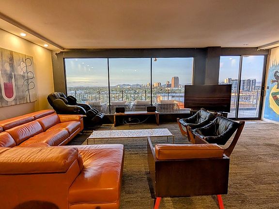 Penthouse Dreams in the Roosevelt Arts District. A rare opportunity to own one of a few true penthouses in Metro Phoenix. Set along the grass-and-tree-lined streets of the historic Roosevelt District, where mid-century style meets dramatic skyline and mountain views, this two-bedroom, two-bath penthouse spills out onto one of the largest penthouse balconies in the US. The balcony wraps around 2 sides of the building with unobstructed 270-degree views of the Phoenix skyline and mountain ranges that stretch more than fifty miles. Mornings feel cinematic, nights glow electric, and every sunset hits like a live art installation. Inside, floor-to-ceiling windows flood the home with natural light, blurring the line between indoors and out. The open layout flows easily from kitchen to living to balcony. It's a low-key trophy property, modern with soul. For the collector at heart, the seller who has called this building home since 1991 is offering something even rarer: the adjacent penthouse is also available, allowing both units to be combined into an expansive 2,704-square-foot dream home in the sky. Select artwork by Red-Chip artist Bill Dambrova is available for purchase, transforming this space into a living gallery. HOA fees include electricity, water, gas, sewer, trash, parking, hazard insurance and CAM. The building offers secure access, a pool area, and fitness center, steps from the vibrant Roosevelt Arts District, brimming with culture, dining, and nightlife. With a Walk Score of 92 and Bike Score of 87, this location defines convenience and connection. This isn't just a home, it's a flex, a statement, and a front-row seat to the city's evolution. Own the view. Own the vibe. Own the moment. Let your next chapter begin