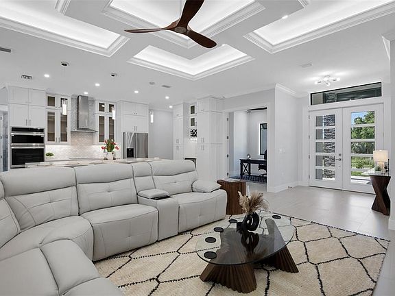 A true gem, new and never lived in. A very unique contemporary custom house with pool/spa built by a reputable local builder, right in the middle of everything - minutes to the beach (under 2 miles), downtown Venice, Pineview School and the new Memorial Hospital. Very hard to find upgrades and unsurpassed craftsmanship, to name a few: - 15 ft high outside entryway - front of the house decorated with natural quartzite stone and Bahamas shutters - double designer 8 ft door and matching interior 8 ft doors - open area complemented by 24x48 beach dune porcelain tile imported from Spain, inspired by Florida beaches - electric fireplace and decorative ceiling beams with LED lighting in living room - impact windows and sliding glass doors throughout - crown molding in open area and master suite - designer grade kitchen with ceiling height cabinetry, deluxe appliances and 10 ft x 6 ft island with waterfall sides - built-in wall oven and microwave - designer grade tile in master bath with LED niche, bench, standalone tub and multiple shower heads - 10 ft tall ceilings throughout - great outdoor space with St. Augustine grass, fenced in property for privacy - heated pool/spa with pool cage to be enjoyed year around for a true Florida lifestyle - great outdoor kitchen with sizeable, covered lanai just perfect for quiet evenings or large party entertainment - boat ramp across the street - very close proximity to Legacy Trail - very desirable X flood zone (no flood insurance coverage required) - great shopping, golfing, fishing, boating and everything else Florida has to offer - quiet and private street with no association restrictions and no CDD - very custom home (not a cookie cutter), unlike any others around This is the one to call home! All furniture, appliances and accents shown in the pictures convey with the house, including 2 large TV sets.