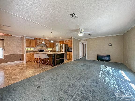 Don't miss this fantastic TURN KEY opportunity located on a large CORNER LOT located minutes from NAS Pensacola, downtown Pensacola and beaches. This pristine 3 BD/2 BA home has a NEW 2023 ROOF & 2020 HVAC and boasts a split floorplan with a large living room open to the gorgeous kitchen with large island, recessed lighting, ample cabinet space, updated stainless refrigerator, and dining area. The master suite has a large walk-in closet, double vanity, garden tub and separate shower. The additional bedrooms with NEW CARPET and bathroom are located on the opposite side of the home. Just off the laundry room (washer & dryer included) is a covered back porch. There are TWO outdoor sheds large enough for storage. See it today!
