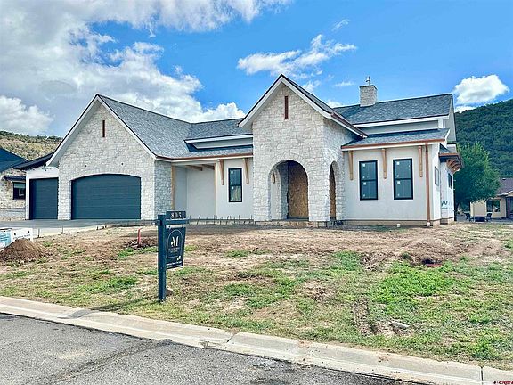 Mayberry Builders presents 805 SE Pinyon Street – a nearly completed European-inspired masterpiece on the Deer Creek Golf Course, nestled at the base of the Grand Mesa in Cedaredge, Colorado. With 2,243 square feet, 4 bedrooms, and 2.5 bathrooms, this estate blends timeless craftsmanship with modern comfort in a way that few new-builds can. From the moment you arrive, you’ll notice the incredible attention to detail and the thoughtful flow of the design. Stepping through the arched oversized entry, the main living space opens to high vaulted ceilings and a stunning stone fireplace that anchors the home with warmth and elegance. The trim package and all woodwork—crafted entirely by hand in bleached Knotty Alder by artisan Jonathan Gerspach—set this home apart with heirloom-quality craftsmanship. The kitchen and dining areas are framed by effervescent natural light and accented with European-inspired details that speak to both function and form. Custom cabinetry, luxurious New Venatino Beige quartz countertops, high end appliances, and a layout designed for entertaining and everyday ease make this space the heart of the home. Anderson windows and doors throughout draw in the surrounding landscape and connect seamlessly to the multiple outdoor living spaces, perfectly suited for evening gatherings or quiet mornings. Shaw Exquisite waterproof engineered wood will flow through the home, with plush carpet in the bedrooms. Forced air heating and cooling plus a gas fireplace keep the space comfortable year-round. The walk-in pantry boasts a “Costco Door”- wherein you can transfer bulky items or groceries directly from the garage into the pantry. The primary suite is a retreat of its own, featuring luxurious finishes and separate vanities, a zero-curb spa-style shower, a walk-in closet fit for royalty, and private patio access. Three additional bedrooms and a spacious guest bath complete another private wing of the home, while a half-bath provides convenience for guests. Wide hallways, flowing transitions, and thoughtful details at every turn create an elevated living experience you won’t find with any other home on the market. The property was intentionally crafted to be a "zero curb" home, making it highly accessible and easily accessed by all. Every inch of this space reflects the builder’s commitment to quality and a legacy of craftsmanship. With completion just around the corner, this is your opportunity to own one of Cedaredge’s most distinctive new homes. There are still opportunities for a buyer to select a number of finishing touches- don’t miss it!