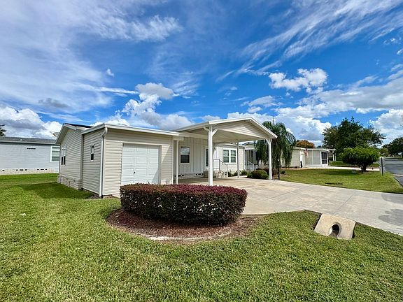 Located in Water Oak Country Club, Lady Lake, FL, an active 55+ manufactured home community. 2014 2 bedroom plus den, 2 bathroom home just listed. Bright open living room, dining area and kitchen. Front den is perfect for an office or craft room. 2nd bedroom is right across from guest bathroom which is great for your overnight guests. Primary bedroom has an en suite and walk-in closet. Inside laundry. New water heater. Double driveway and carport for plenty of parking. Golf cart shed with roll up door. Home is located close to the back entrance/ exit, satellite clubhouse and new pool amenity area that's coming soon. Lot rent includes land lease, 24 hour manned gate, lawn mowing and amenities except for golf. Amenities include an outdoor sports complex, 2 clubhouses, 2 pools, walking trails, dog parks, catch and release fishing, 24 hour fitness center and so much more!