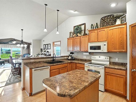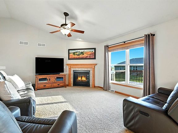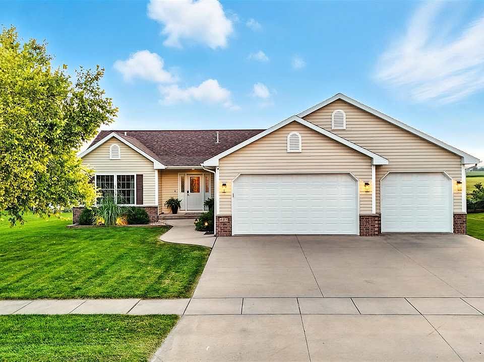 Exceptional one-owner ranch home on a scenic lot with countryside views! This thoughtfully designed home offers 4 bedrooms, 3 baths, and an open layout ideal for everyday living. Welcoming front porch entry opens to vaulted ceilings and a spacious living room with a cozy corner gas fireplace. The connecting kitchen boasts a large island, breakfast bar, dual pantries including a walk-in corner pantry, and ample cabinetry. Adjacent formal dining area leads to spacious sunroom. Off the sunroom is a 12x14 deck—perfect for enjoying the private backyard. The primary suite features a private bath with dual vanities, a soaking tub, separate walk-in shower and a large walk-in closet. The main floor also includes a laundry room with a soaking sink and drop zone space. Two additional bedrooms and a full bath on the main. The recently finished lower level offers a huge family room, rec/office space, 4th bedroom, full bath, and generous storage room. Enjoy mature trees, landscaped yard, and a backyard shed. Don't miss the heated 3-stall garage with epoxy floors & built-in shelving. Also included is a spacious backyard storage shed.