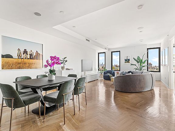 Entering apartment 7B, follow the long gallery hallway through dreamy herringbone white oak floors, leading into an airy, bright, and 23'+ grand open-concept living and dining space. Picturesque windows facing quiet Lincoln Place boast Manhattan skyline VIEWS and bathe the room in sunlight.