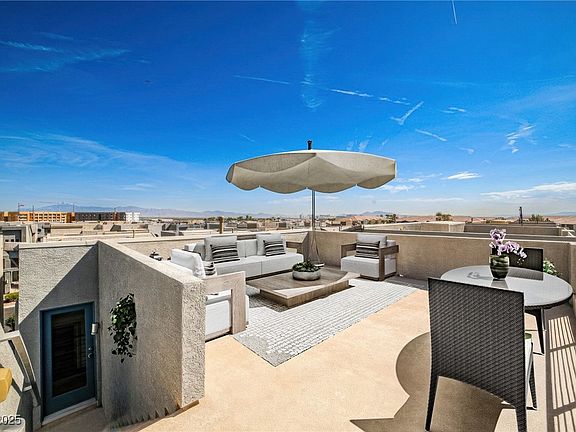 Modern, charming tri-level home in a secure gated community near the new SW Costco with easy I-215 access, just minutes from the Strip and airport, featuring a private ground-level living room opening to a carefree backyard with built-in firepit/BBQ, a second level with open loft and two extended bedrooms with resort-style baths, a third level offering formal living and entertainment space with balcony and mountain views filled with natural light flowing into the gourmet kitchen and dining area with custom cabinetry and large eat-in island, plus a rooftop terrace with stunning city views for exceptional outdoor entertaining.