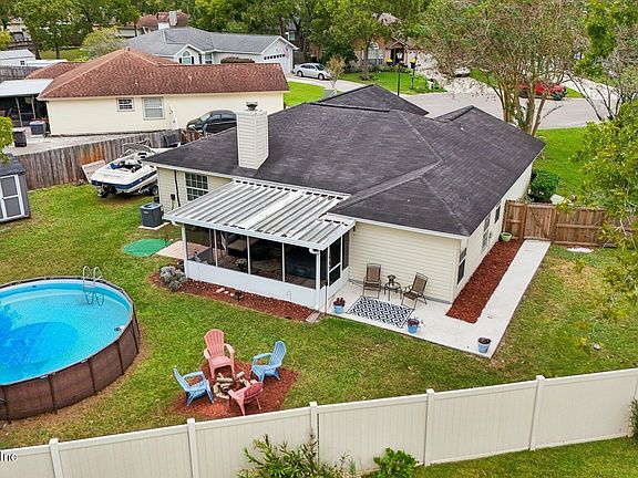 Move-in-ready home on a cul-de-sac with low HOA fees and conveniently located near Oakleaf Town Center. The well-planned floor plan includes split bedrooms, a spacious great room with vaulted ceiling, cozy wood burning fireplace, and flexible formal dining area that could be transformed into a home office or a 4th bedroom. The updated kitchen is centrally located and overlooks the great room so the family chef can create wonderful meals while still being a part of the activity. The kitchen is large enough to accommodate a breakfast table and has an abundance of modern cabinets, stainless appliances and corian countertops. The primary retreat features a custom wood wall, and a beautifully updated ensuite bathroom with a separate garden tub. The outdoor spaces do not disappoint! A screened covered patio with a hot tub leads to a fully fenced back yard with an above ground pool that is less than one year old . You can enjoy the outdoors year-round whether entertaining, grilling out, sitting by the fire pit, soaking in the hot tub, or relaxing in the pool on hot Florida days. The extended and widened driveway offers extra parking and access to the double gate on the side for storing your extras. A work bench in the garage makes it convenient for those handyman projects. Don't miss the outdoor shed for extra storage! Conveniently located near Oakleaf Town Center where you can shop, dine or find entertainment, and minutes from I-295 for an easy commute to anywhere you need to be.