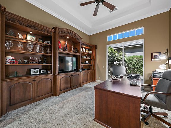 Popular Sedona floor plan, offers free flowing kitchen, family living area, dining and bar areas,perfect for entertaining. A dramatic rotund,entry foyer, deluxe crown moldings, custom paint throughout, custom bookshelves, the list goes on & on! Ultimate privacy is offered with this lot orientation to enjoy a fabulous outdoor living area, with built-in BBQ & counter bar area, cooling mister system, & welcoming pebble tech, salt system pool & spa for your outdoor enjoyment. Surround sound system speakers in master, den, & patio. Extra side patio off den with slider for easy access. Solar tubes in dining room & 1/2 bath. Convenient custom pull out shelves in kitchen & bar. Truly a home designed with an enjoyable lifestyle in mind. Golf membership transfer is available outside of escrow. NO waiting.