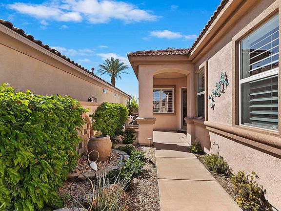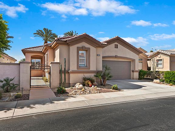 Welcome to this easy-living home with sumptuous Santa Rosa mountain views. A welcoming foyer opens to the great room layout with expansive kitchen and breakfast bar for fluid entertaining. The pristine 2B/2B plus-den home offers bedroom separation and ample office space. Rich chocolate cabinetry, silver hardware and granite counters enhance the spacious cooking space. The main bedroom suite boasts an oversize bathroom with a walk-in closet and direct access to the artfully landscaped patio overlooking the southern sweep of the 17th fairway (without fear of errant golf balls). The enclosed front courtyard features a lovely xeriscape garden, the perfect welcome to this well-cared-for home. On a desirable street close to the main clubhouse, this home is a great fit to this special active-retirement club. At Heritage Palms, there is no initiation fee, you own the Arthur Hill designed golf course! Your low HOA dues give you access to tennis, pickleball, card and billiard rooms, indoor & outdoor pool, fitness center, banquet facilities, and a fabulous restaurant. It even includes cable TV and high-speed internet access.