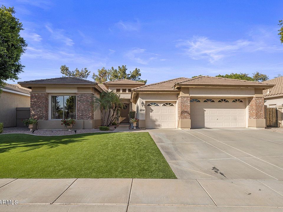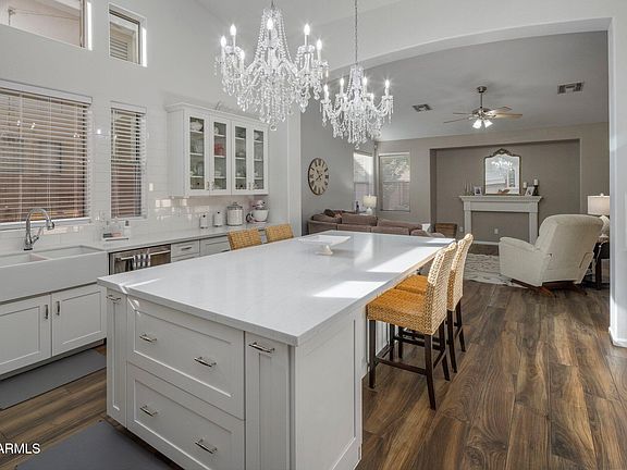 WOW! Stunning basement home located in Alisanos, one of the most prestigious gated neighborhoods in Tempe. This beautiful home features 4 bedrooms plus office and 3.5 baths. It is a split floor plan with Primary Suite, 1 guest bedroom and office on the main level and 2 additional bedrooms downstairs with an additional family/game room. Owner has recently installed faux wood tile flooring through the main areas. The kitchen has been totally remodeled with upgraded white cabinets with some glass fronts, quartz counter tops, high end appliances including an ILIVE Majestic free standing gas oven/range and a wall Bosch cappuccino machine. The kitchen also boast a custom vent hood, large island with seating and chandeliers. Kitchen is open to large family room. Synthetic grass front and rear. The rear yard has a pool and spa, covered patio, built -in BBQ