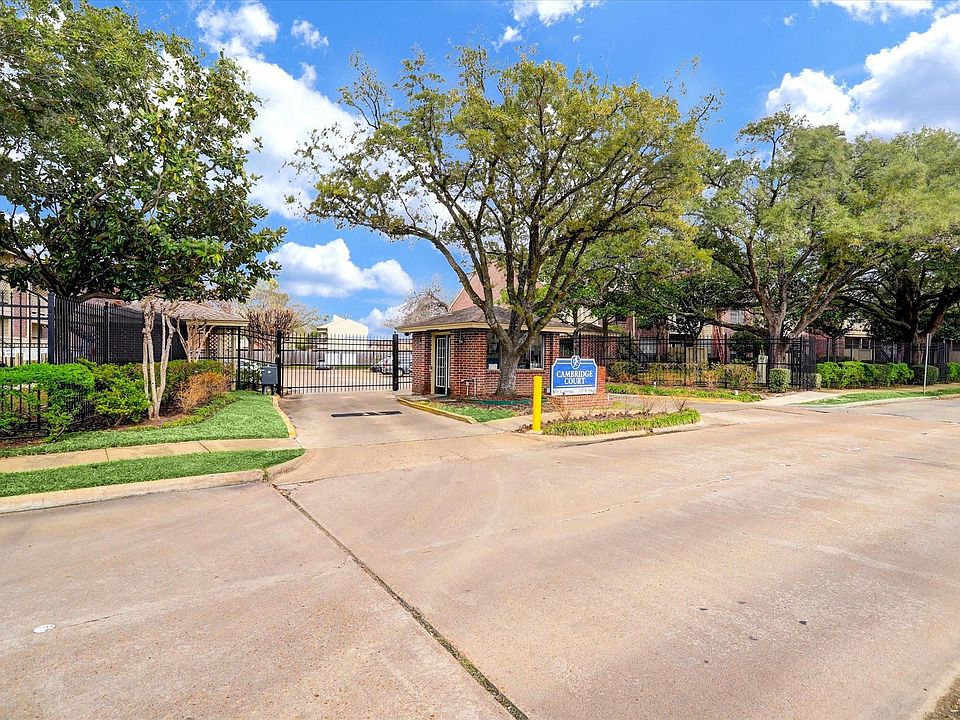 First Floor, Corner Unit! This condo features 2 spacious bedrooms and 1 full bathroom with a shower, within a gated community just minutes from the Tx Medical Center. Open-concept living and dining area complete with wood burning fireplace. Private patio with outdoor storage. Patio only accessible from inside unit. The kitchen offers generous cabinetry and a convenient breakfast bar. Primary bedroom includes a walk-in closet, while the second bedroom is ideal for guests or a home office. Unit also includes in-unit laundry room perfect for stacking units, reserved parking, and access to the community pools and hot tubs. Easy access to major freeways, Texas Medical Center and Downtown Houston. Metro rail is walkable.