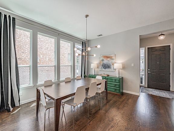 Downstairs has an office with French doors and wood floors. Wood floors throughout the open dining, kitchen, and living areas. Kitchen features a large island, tons of cabinet space, gas stove and an open pantry.