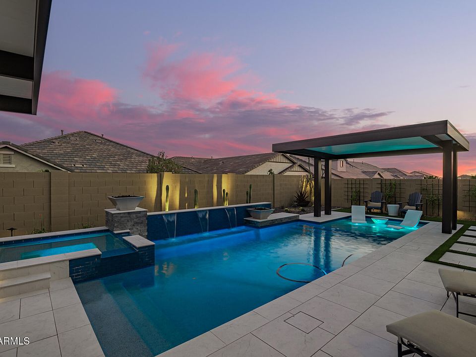 This luxury home sits on a N/S interior lot in the prestigious gated community of Monteluna, surrounded by the scenic Upper Sonoran Desert in NE Mesa. The open, split great room floor plan features soaring 12' ceilings, a wall of glass slider, large plank tile, plantation shutters throughout, in-ceiling surround sound, & full home automation. 3 bedrooms + a den (easily converted to a 4th bedroom) & 3 full baths, this home offers spacious, flexible living. The chef's kitchen boasts a large quartz island, GE stainless appliances incl. gas cooktop, wall oven, pot filler, built-in microwave, & hood, a butler's pantry & 42'' spiced maple cabinets with crown molding & soft-close. Step outside to your resort-style backyard with a gas-heated pebble-tec pool/spa, water feature, in-ground... ...cleaning, large baja step with its own lighted awning, outdoor kitchen w/built-in BBQ, bar seating, & separate lighted gazebo. Large covered patio with fan and speakers, and citrus and fruit trees. The 3-car tandem garage includes a 2' extension, epoxy floors, built-in cabinets, 220/50 and 110/20 amp outlets, & service door.