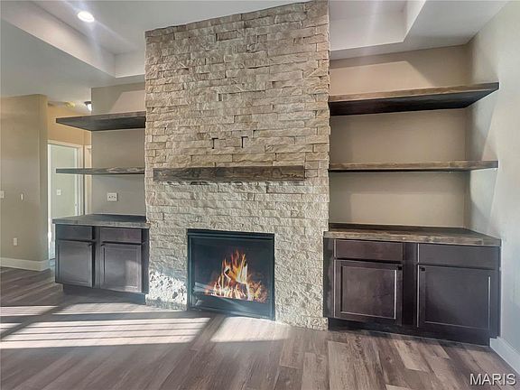 Step inside to an inviting open floor plan featuring a spacious living room with a beautiful stone fireplace flanked by custom wood shelving - an ideal gathering space for cozy nights in or entertaining guests. The kitchen is a chef’s dream, showcasing solid surface countertops, a large center island, sleek cabinetry, and quality finishes throughout.
