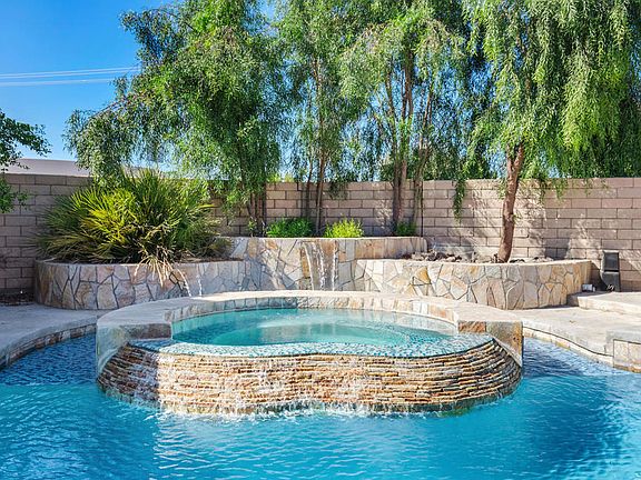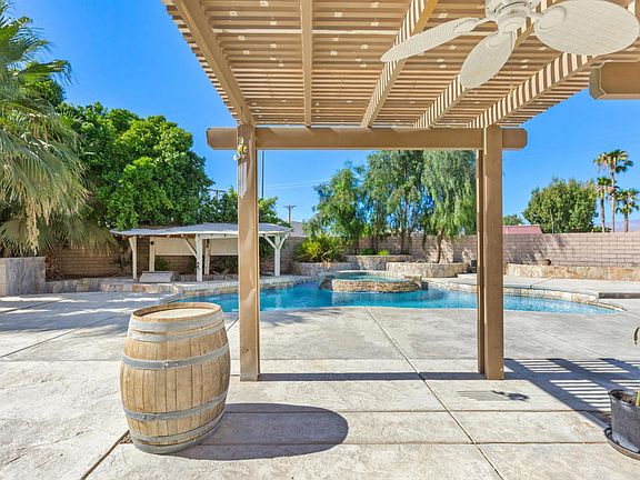 Perfect Desert Paradise or Investment Property!! Located in the Shields Ranch Community this 5 Bedroom/3 Full Bath home has everything you've been asking for with No HOA. Situated on one of the largest corner lots enjoy 10,019sqft of outdoor living space. Including a custom pool/spa with swim-up bar stools and BBQ. A tile tanning feature surrounds the gorgeous pool/spa with stone waterfall and pool fountains. The large patio includes a long lasting alumawood patio cover, straw palapa, and firepit with stamped concrete decking. Extra room on this huge lot for RV PARKING and a pass through garage to the outdoor space. Enter through the front door passing a small putting green to vaulted ceilings and lots of light. Stained concrete floors lead from the living room to a separate dining room with glass sliders to the outdoor space. Kitchen opens to the family room with a gas fireplace. Through the downstairs hallway find a separate laundry room, full bathroom, and fifth bedroom or office. Primary bedroom and three additional upstairs bedrooms with two full bathrooms. Master bedroom with double vanity in the ensuite bathroom plus a walk-in and additional second master bedroom closet. The Shields Ranch Community is located on the edge of Indio nearby shopping, restaurants, schools, and Hwy 111. Short Term Rentals Okay with NO HOA or Mello Roos. Call for more info or a personal showing!!
